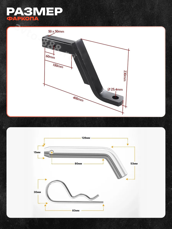Полная комплектация: В набор входит усиленный кронштейн, хромированный сцепной шар, стопорный палец и шплинт.