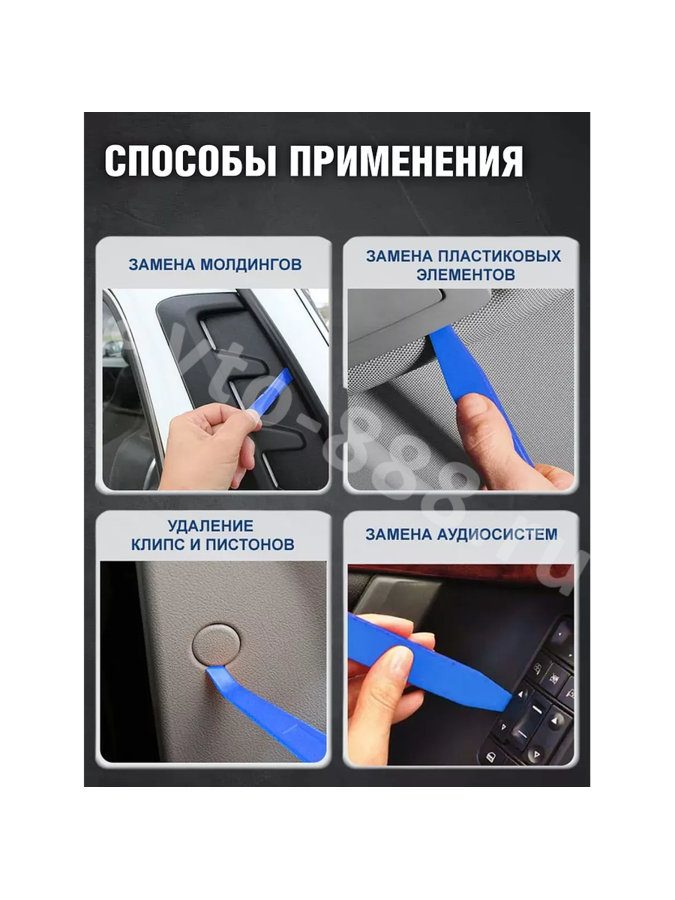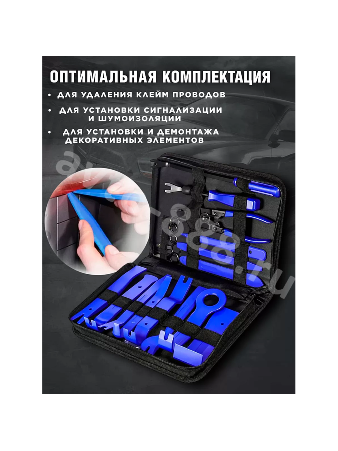 Набор съемников 19 предметов от Авто Центр для снятия обшивки, клипс, пистонов в салоне и багажнике автомобиля. Комплект инструмента для разборки салона авто, позволяет аккуратно разобрать салон, сделать шумоизоляцию без повреждений элементов, провести демонтаж внутренней обивки, молдинга, магнитолы, торпедо и других пластиковых частей внутренней отделки, не царапая и не нанося повреждений окрашенным, хромированным и другим поверхностям. Набор инструмента является универсальным и подходит под любые машины легковых и грузовых , любой марки (лада (Lada), рено ( RENAULT) , ниссан (nissan), киа (kia), хендай (Hyundai ) , ВАЗ, митсубиси (MITSUBISHI) , сузуки ( Suzuki ), вольво ( volvo), ГАЗЕЛЬ и др. В наборах присутствует различные виды наборов ключей съемников лопатки, скребок для стекол, шпатель, ключи, вилочки и клипсодеры для работ: обшивки салона, инструмент для разборки салона; Облицовки панелей и клипс. Набор для установки и снятия радио/cd проигрывателя автомобиля и др. В ассортименте имеются комплекты, включающие в себя 19, 38, 32, 40, 45 - предметов из высококачественного пластика. Удобный кейс органайзер не занимает много места при хранении и транспортировке в салоне или багажнике с набором ключей или наборами инструментов для автомобиля по ремонту и строительству или набором автомобилиста. Отличный мужской набор, подарок для мужчины, подарок автомобилисту, автолюбителю, автомастеру на любой праздник : 23 февраля, Новый год, Рождество, День Рождения, Годовщина, День Святого Валентина (день влюбленных, Юбилей, День Отца, День Учителя и др. Набор автомобилиста для него , ремкомплект для папы, дяди, брата, сына, любимого мужа, парня, зятя, тестя, свекру, дедушке, коллеге, боссу, руководителю и др.
